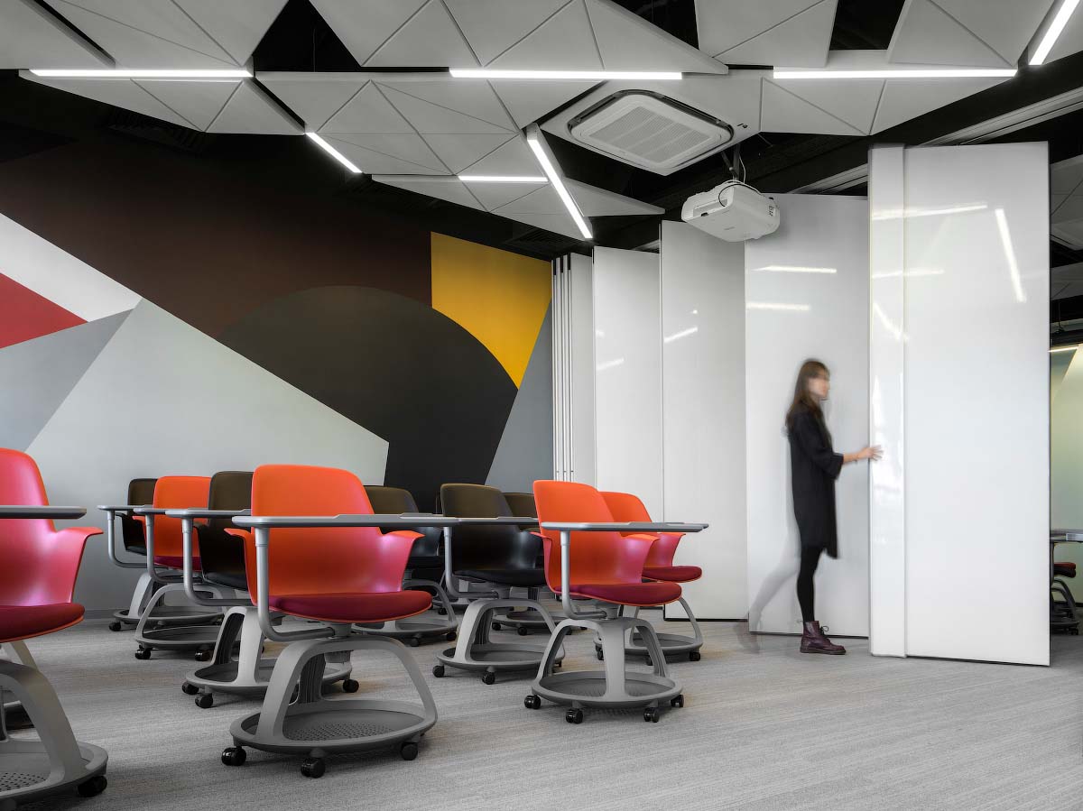 We did the design colourful awaking to motivate team members for active thinking and to make visitors remember the space. In the big class there is a transforming wall to divide it into two small classes if needed.